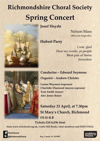 This will be Edward Seymour's final concert as our Music Director and he goes on a rousing note which with Andrew Christer on the orgen of Richmond's parish church, will send him on his way knowing that he has left the choir in good heart for his successor. We hope the audience will join in enthusiastically with the rendering of Jerusalem to close the evening.