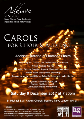 The Addison Oratorio and Chamber Choirs combine to celebrate Christmas at St Michael & All Angels in Chiswick. As well as Carols for choirs and the audience, the programme includes 'Ave Rex', an exciting sequence of Carols that set medieval texts by the Welsh composer William Mathias, the world premiere of a new piece especially written especially for the Chamber Choir by Martin Butler, and two pieces by Master of the Queen's Music Judith Weir ( one of them also including audience participation), who we are honoured to have as featured composer this year. All that and some popular carols by Harold Darke, Hector Berlioz and Peter Cornelius, should make a memorable start to the Christmas season!