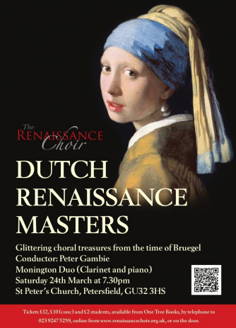 Add to my Calendar 24-03-2018 19:30 24-03-2018 21:30 36 Dutch Renaissance Masters This is the first of several themed concerts we will be singing this year which will be based on lesser-known composers and works from the Renaissance. Our first programme of the year focusses on music from the Low Countries, including Lassus, Clemens and Sweelinck. The choir will sing a balance of intensively beautiful sacred works and jaunty secular pieces. St Peter's Church, Petersfield DD/MM/YYYYDetails