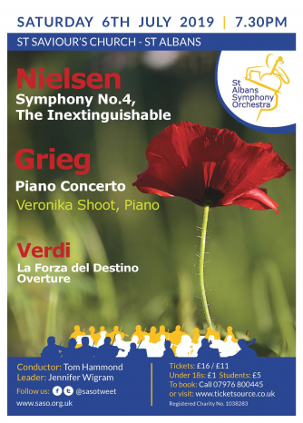 Add to my Calendar 06-07-2019 19:30 06-07-2019 21:30 36 St Albans Symphony Orchestra: Summer Concert Grieg was the first composer from Norway to achieve major international recognition, and it was his Piano Concerto that brought him his first great success. Devon-based pianist Veronika Shoot is a former pupil of the Yehudi Menhuin School and Hertfordshire’s Purcell School who has gone on to win international acclaim. Nielsen composed his Symphony No.4 in 1916 against the backdrop of the First World War. It is subtitled The Inextinguishable because he wanted it to be a manifesto for what he thought of as the fundamental lifeforce of music. St Saviour's Church, St Albans DD/MM/YYYYDetails