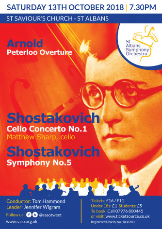 Add to my Calendar 13-10-2018 19:30 13-10-2018 21:30 36 St Albans Symphony Orchestra Shostakovich’s Cello Concerto is widely considered to be his finest concerto because of the way it combines powerful musical ideas with extraordinary virtuoso writing for the soloist. We are delighted to be joined by Matthew Sharp, internationally recognised as a compelling classical artist. The premiere of Shostakovich’s Symphony No. 5, written at the height of the Stalinist purges in 1937, was a huge success and received an ovation that lasted well over half an hour. The work’s popularity grew rapidly and today it remains his best-known symphony. St Saviour's Church, St Albans DD/MM/YYYYDetails