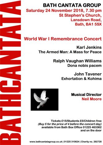 Bath Cantata Group recalls the end of World War I with a concert full of music for remembrance. Karl Jenkins’ evocative and powerful The Armed Man: A Mass for Peace leads the billing, dedicated to victims of the Kosovo crisis. Alongside this is Vaughan Williams’ Dona nobis pacem written in 1936 as a plea for peace by referring to recent wars during the growing fears of a new one. John Tavener’s Exhortation & Kohima beautifully state the familiar texts ‘They shall grow not old’ and ‘When you go home, tell them of us and say: For your tomorrow we gave our today’.