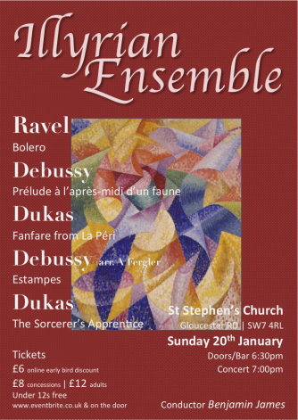 The concert will begin at 7:00pm with the Illyrian Ensemble's founder and artistic director Benjamin James leading you through an evening of French masterpieces. A particular highlight will be the premiere of Adam Fergler's arrangement of Debussy's Estampes.