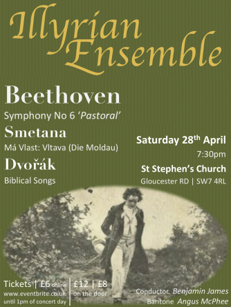 The Illyrian Ensemble will meander through Smetana's depiction of the Vltava River from his Ma Vlast suite, before being joined by baritone Angus McPhee to perform Dvorak's Biblical Songs - not often performed in their orchestral setting. Beethoven's Pastoral Symphony will round off an evening of music inspired by the countryside and God, conducted by founder and artistic director Benjamin James.