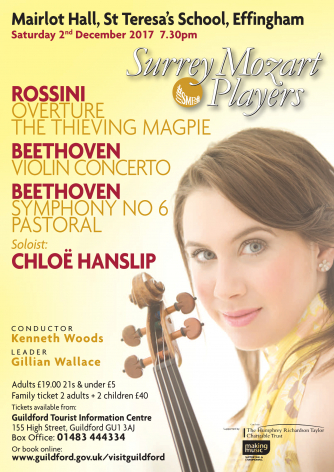 Guildford-based chamber orchestra, Surrey Mozart Players are delighted to be performing Beethoven’s gorgeous Violin Concerto with world-renowned violin soloist, Chloë Hanslip in the beautiful surroundings of St Teresa's School. Chloë was brought up in Guildford and made her BBC Proms debut in 2002, and has since gone on to appear as soloist with all the major orchestras around the world. Anyone who loves Beethoven, the violin or exquisite playing cannot afford to miss this fabulous concert. With keenly priced tickets for 21s and under, this concert will appeal to all ages and will include insightful and thoughtful introductions to the music by Musical Director, Kenneth Woods.