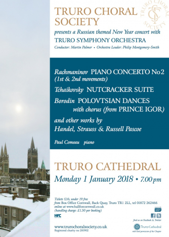 The mixed programme will include Handel’s Hallelujah Chorus and Zadok the Priest, as well as Borodin’s rousing Polovtsian Dances. The choir will be accompanied by Truro Symphony Orchestra, who will also be performing Strauss’s Radetzky March and Tchaikovsky’s Nutcracker Suite (five movements). Paul Comeau will play the first and second movements of Rachmaninov's Piano Concerto No. 2 and Russell Pascoe’s joyous 2012 composition for the choir, Music!, will close the evening.