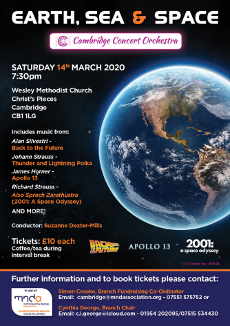 Add to my Calendar 14-03-2020 19:30 14-03-2020 21:30 36 CANCELLED - Earth, Sea and Space - Cambridge Concert Orchestra This is a selection from the programme. Tickets also available from [email protected] or [email protected] Tickets will also be available on the door. Wesley Methodist Church, Cambridge DD/MM/YYYYDetails
