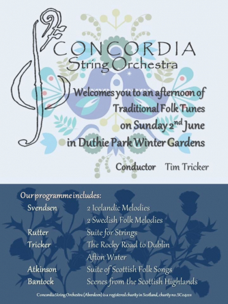 Add to my Calendar 02-06-2019 14:30 02-06-2019 16:30 36 Traditional Folk Tunes Concordia String Orchestra, conducted by Tim Tricker, welcomes you to an afternoon of traditional folk tunes on Sunday 2nd June at 2.30 pm in the David Welch Winter Gardens in Duthie Park, Aberdeen. The concert is free, and you can stop by any time in the afternoon to hear a selection of folk tune inspired music for strings in the lovely venue and surroundings. Winter Gardens, Aberdeen DD/MM/YYYYDetails